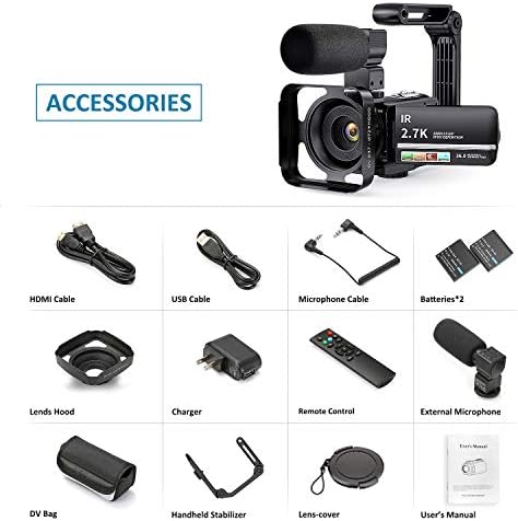 Camcorder with Holder & Lens Hood:Handheld Holder Keep the 2.7K camera stable when recording, Ideal for making moving low angle videos and images,This vlog camera comes with a lens hood,external microphone and remote control.The lens hood filters out excess stray light, prevents lens flare caused by extraneous light and protects against unexpected bumps or shock.Built-in microphone and external microphone make it possible to faithfully reproduce audio.