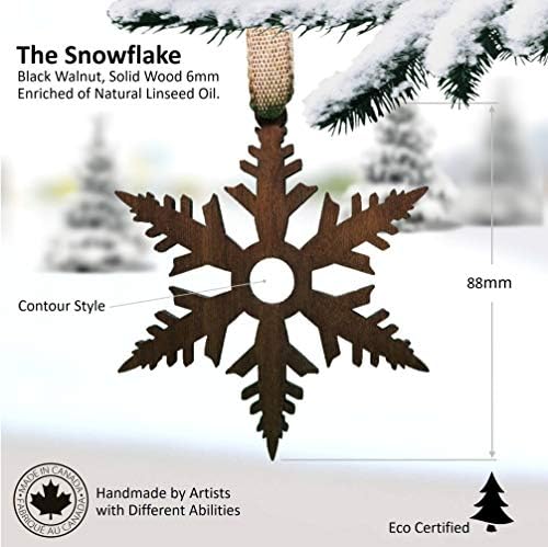 The solid walnut snowflake ornament is a perfect addition to your holiday decoration collection. The classic and crisp wooden look will blend effortlessly with your decor and bring a touch of nature indoors. Our timeless pieces have been designed with extensive attention to detail to bring you a premium product made in Canada. Each ornament is crafted by artists with limited cognitive or physical abilities out of solid wood and enriched with natural flax oil and citrus oil to protect the integrity over time. The trendy Christmas decoration can be hung in your tree, a candlestick or attached to a wrapped present easily with the natural ⅜” grosgrain ribbon. Ideal as a stocking stuffer or to give to family, friends, teachers, coworkers or even as a corporate gift. Our company prides itself on our high quality laser cut ornaments and our devotion to eco friendly packaging made of recycled kraft cartridges from Canada. Enjoy a signed message from our CEO with each package!